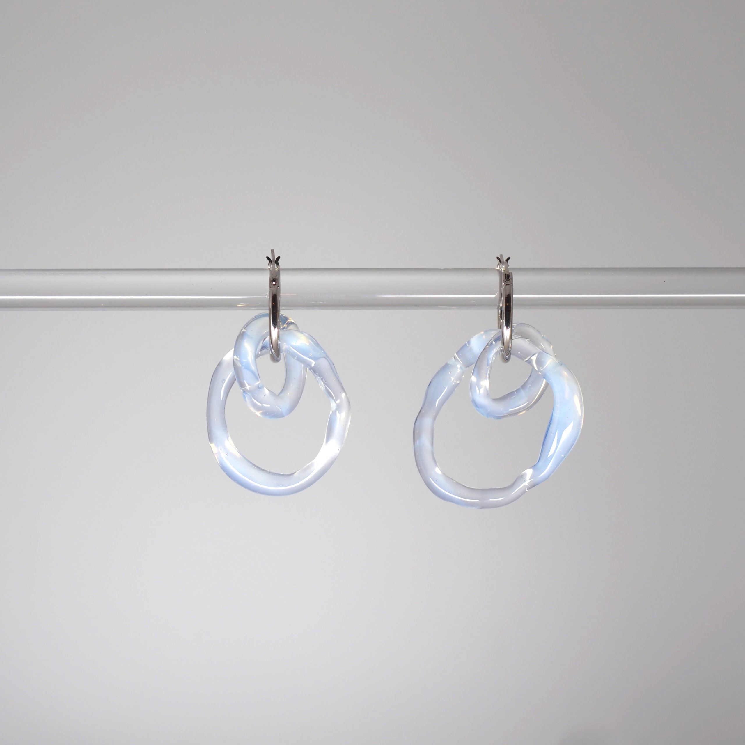 Boucles d’oreilles en verre borosilicate opalescent transparent avec des creóles en argent ou argent plaqué or. Chaque pièce est composé de 2 anneau en verre que tu peux porter de plusieurs façons.